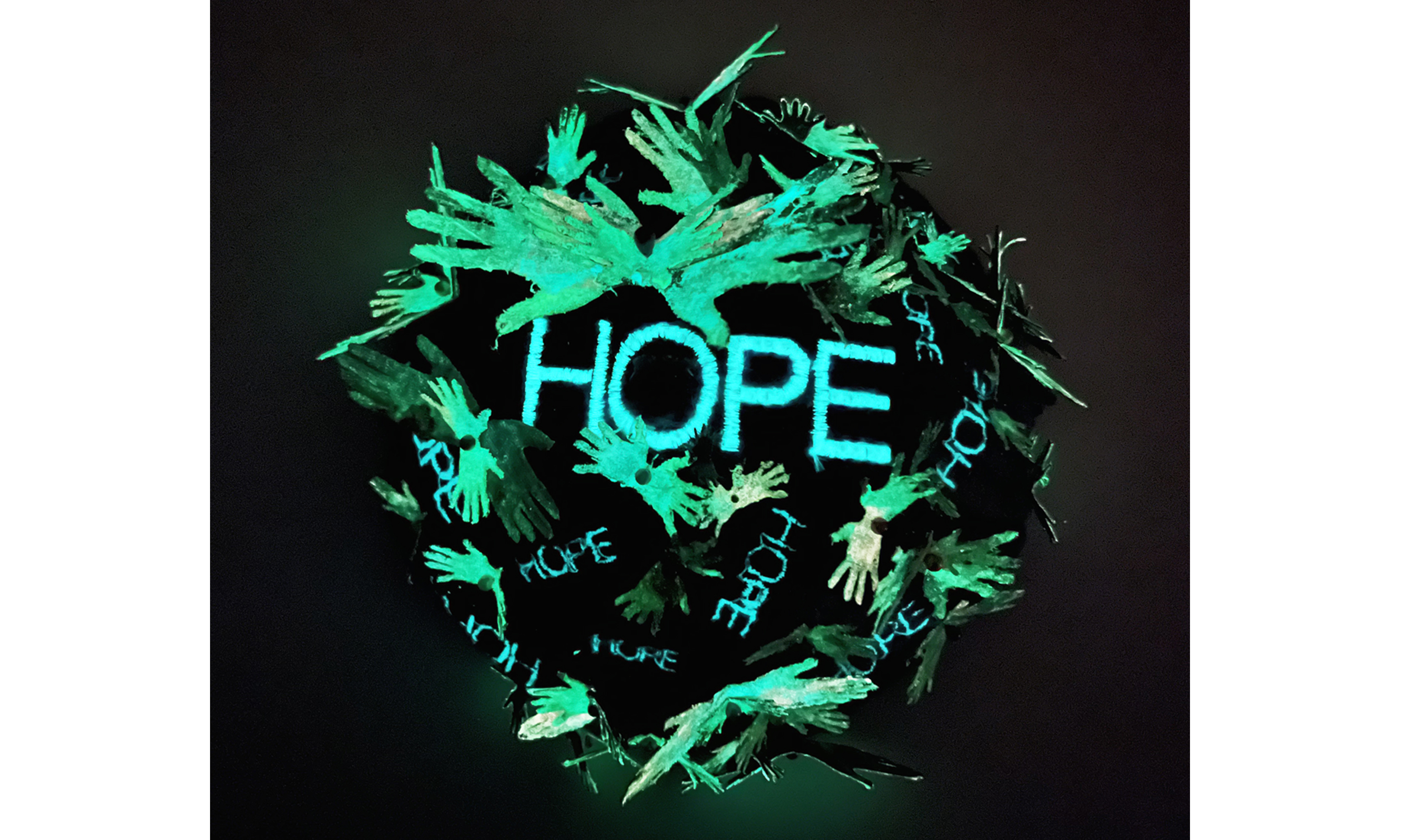 Des mains, tantôt fleurs, tantôt papillons, émergent du sol dans un geste d’alerte, de prière, de transmission ou d’action. Des silhouettes humaines, découpées dans des radiographies, traversent ces microcosmes fragiles : témoins de notre passage elles portent en elles l’espoir d’une réconciliation indispensable avec le vivant. Des palimpsestes luminescents de mots brodés, porteurs de mémoire, de lutte, de solidarité et d’espoir, perdurent dans la nuit des temps.